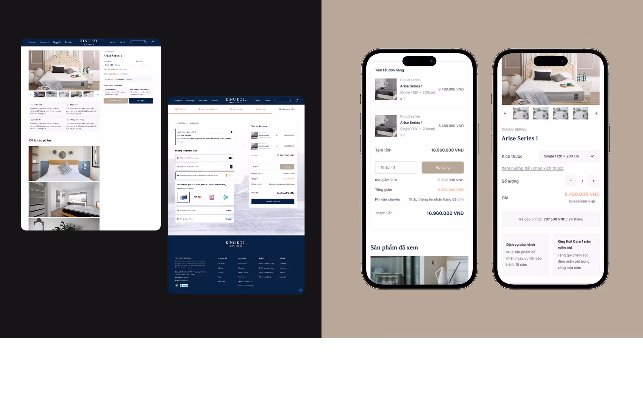 Website e-commerce King Koil hướng đến trải nghiệm mua sắm tinh tế, ấm áp như chính giấc ngủ thương hiệu mang lại. Giao diện tối giản, sang trọng, dễ điều hướng. Tích hợp bộ lọc theo nhu cầu giấc ngủ, công cụ tư vấn chọn nệm phù hợp và nội dung kể chuyện giúp khách hàng hiểu rõ giá trị từng dòng sản phẩm. CTA rõ ràng, hỗ trợ trả góp và đặt lịch trải nghiệm tại showroom. Hệ thống vận hành đồng bộ giữa online và offline, đảm bảo hành trình mua hàng liền mạch và thuận tiện.