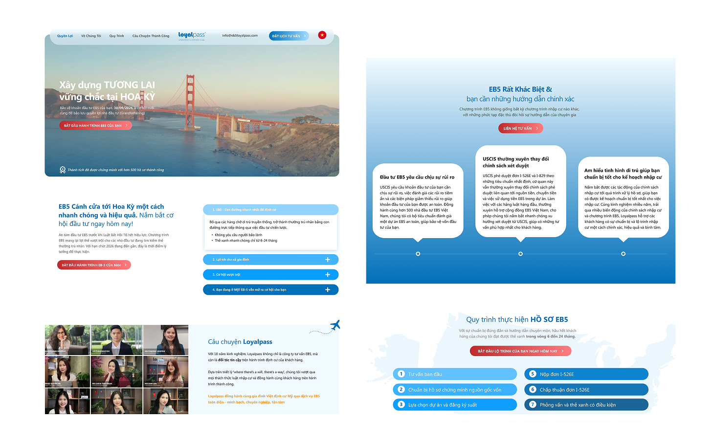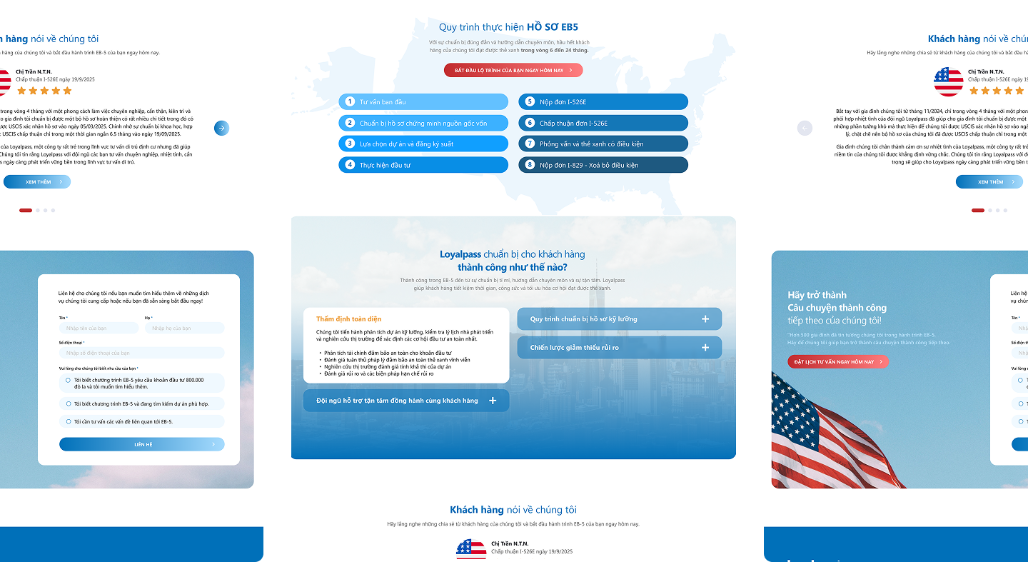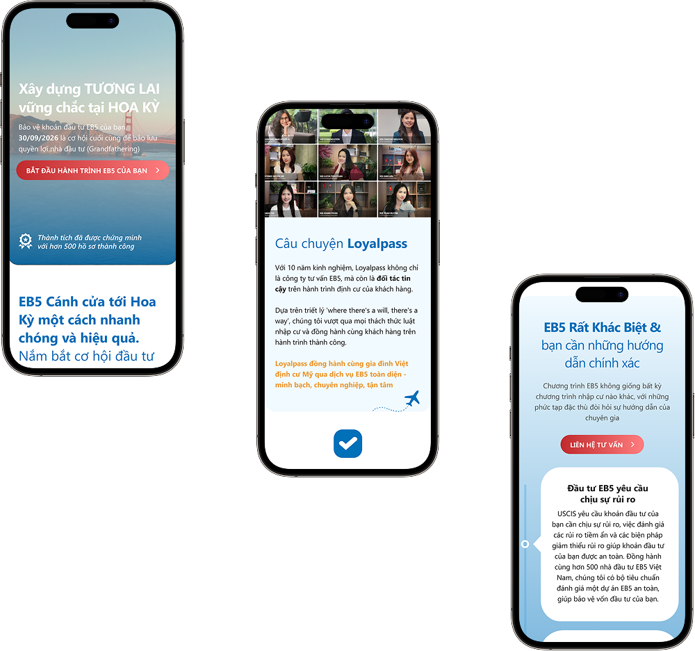 Với hơn 10 năm kinh nghiệm, Loyalpass không chỉ là đơn vị tư vấn EB-5 mà còn là đối tác đồng hành xuyên suốt hành trình định cư của khách hàng. Từ chuẩn bị hồ sơ đến hoàn tất thẻ xanh, Loyalpass cung cấp một giải pháp toàn diện, giúp nhà đầu tư giảm thiểu rủi ro trong một quy trình phức tạp. Landing page được xây dựng nhằm làm rõ bản chất đặc thù của chương trình EB-5 – một hình thức định cư không giống các chương trình nhập cư thông thường, đòi hỏi sự dẫn dắt từ những chuyên gia giàu kinh nghiệm.