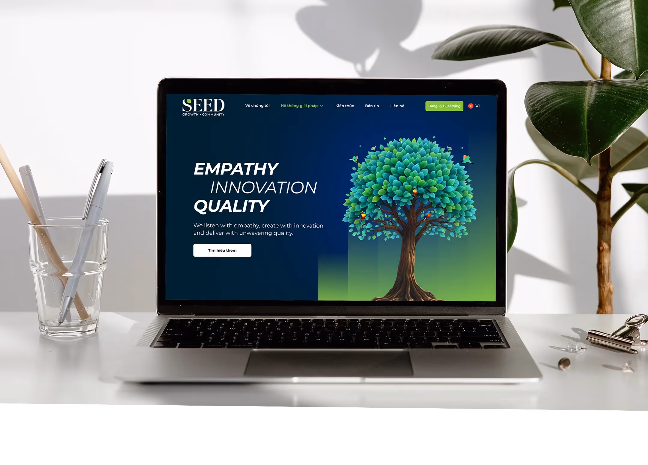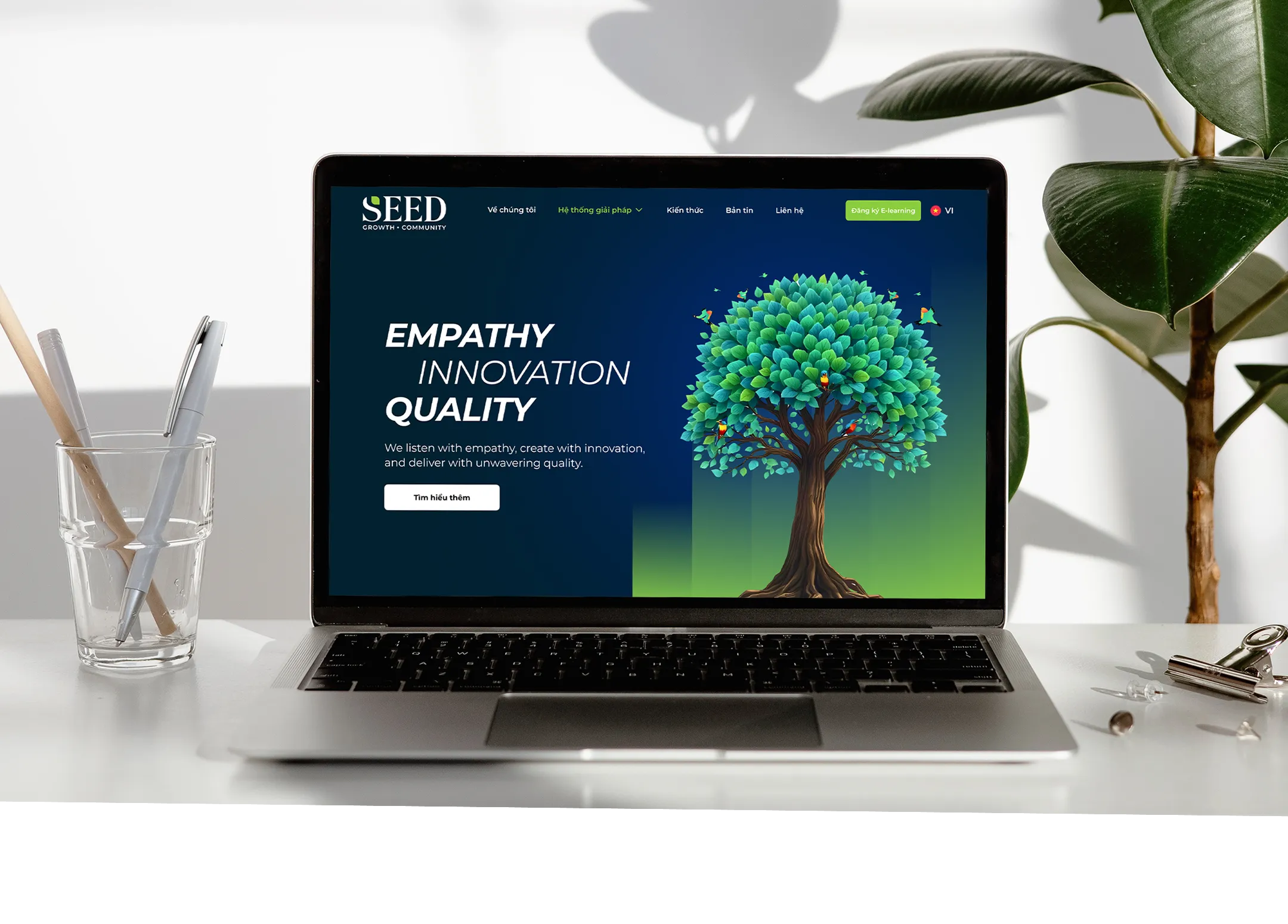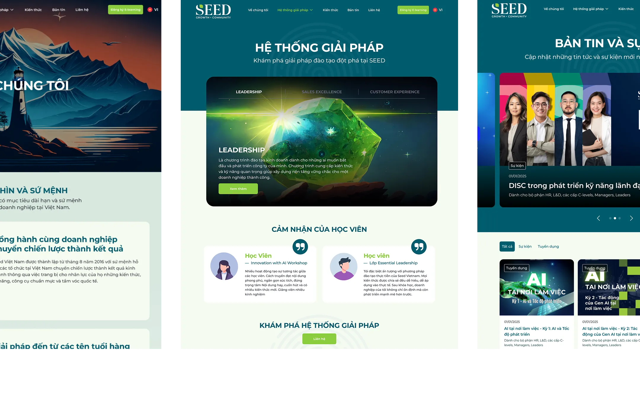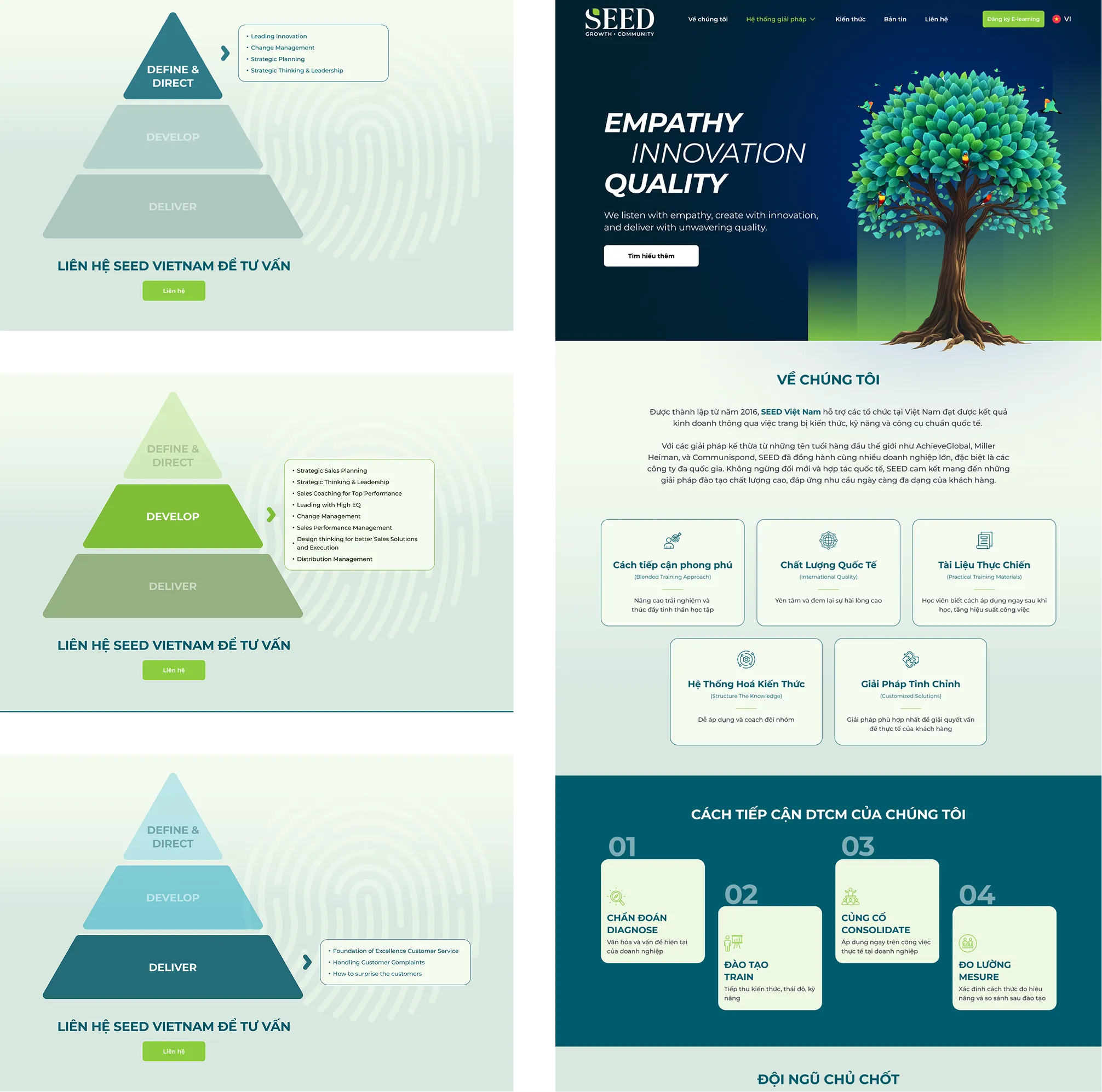 Trong quá trình thiết kế website cho Seed, chúng tôi đối mặt với thách thức lớn khi cần chuyển đổi các infographic phức tạp thành dạng interactive có thể hiển thị mượt mà trên cả desktop và thiết bị di động. Để truyền tải nội dung học thuật một cách trực quan và dễ tiếp cận, chúng tôi đã chọn phương pháp kể chuyện thông qua hình ảnh ẩn dụ của một cái cây – nơi mỗi chương trình đào tạo được phân tầng theo gốc rễ (nền tảng), nhánh cây (kỹ năng chuyên sâu) và lá cây (ứng dụng thực tiễn). Giải pháp thiết kế kết hợp giữa bố cục tối giản, hình ảnh động tinh tế và giao diện người dùng (UI) dễ thao tác giúp giữ lại tinh thần của infographic ban đầu nhưng mang đến trải nghiệm đọc dễ hiểu, logic và trực quan hơn cho người dùng.