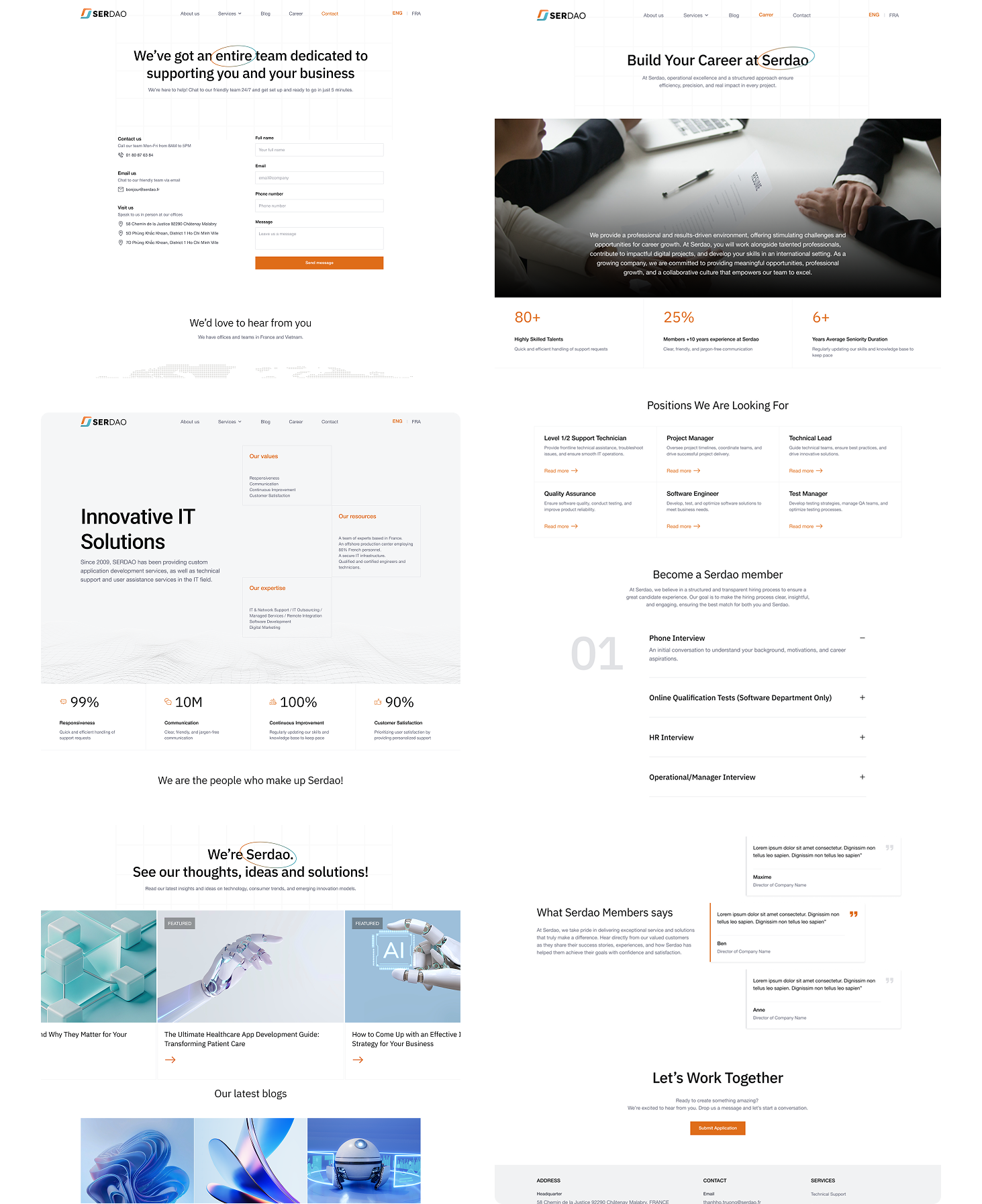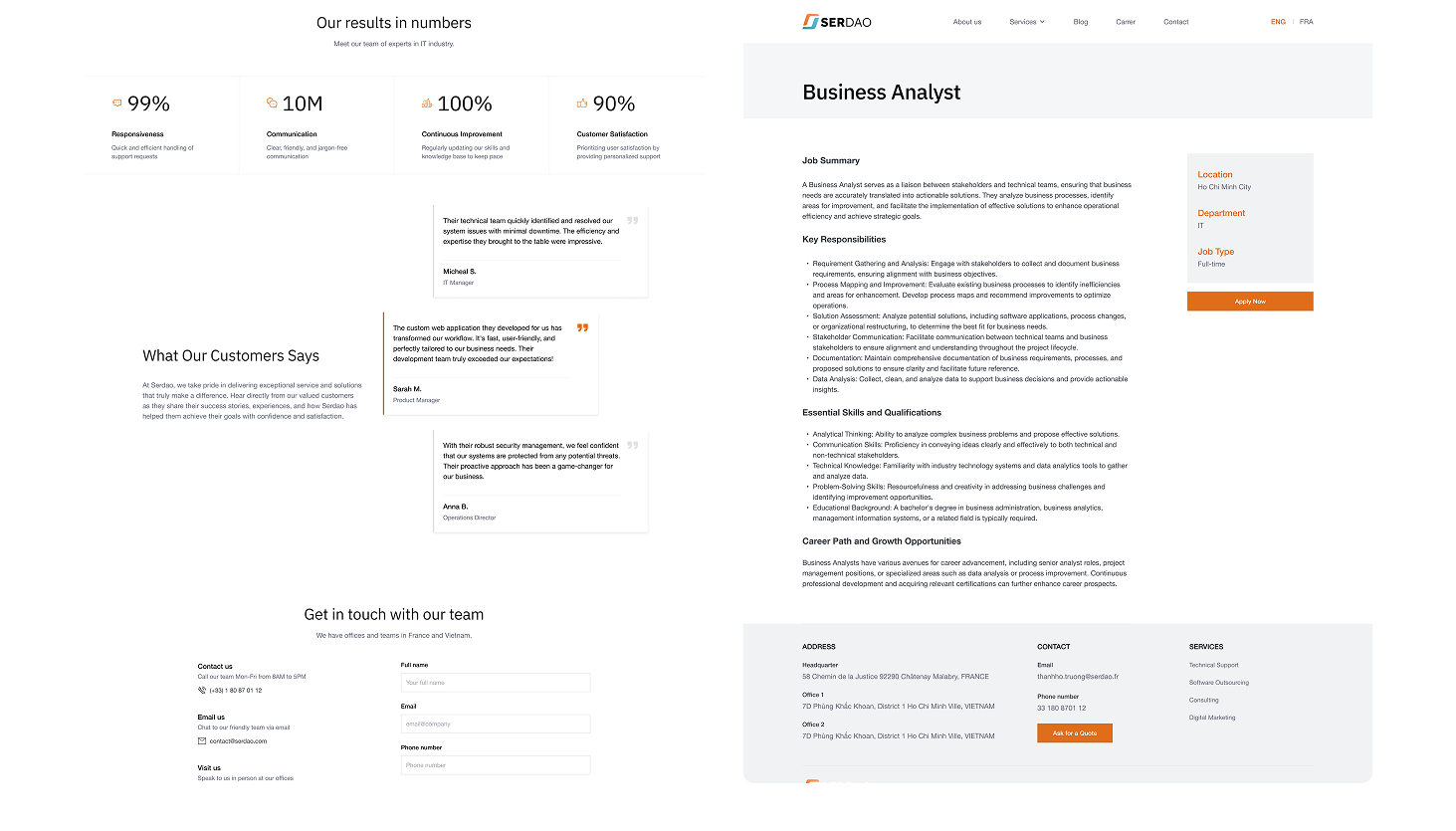 Serdao là công ty cung cấp dịch vụ IT & Network Support, IT Outsourcing và Managed Services cho doanh nghiệp quốc tế. Với mô hình kết hợp giữa trung tâm sản xuất offshore với 80% nhân sự người Pháp, đội ngũ chuyên gia đa quốc gia và hạ tầng IT bảo mật đã giúp Serdao duy trì tiêu chuẩn làm việc quốc tế. Website được phát triển nhằm thể hiện rõ năng lực kỹ thuật, tiêu chuẩn làm việc quốc tế và định vị Serdao như một đối tác công nghệ chuyên nghiệp và đáng tin cậy.