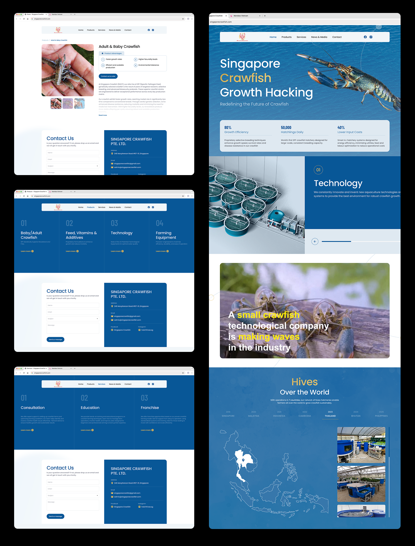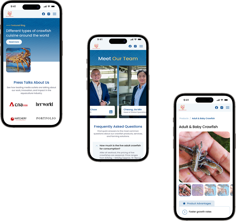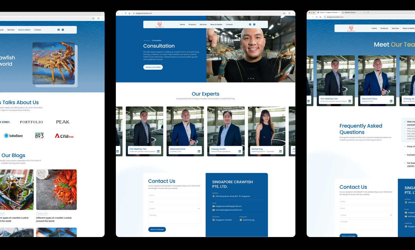 Singapore Crawfish là đơn vị tiên phong trong công nghệ nuôi và sản xuất crawfish quy mô lớn, hiện hoạt động tại 7 quốc gia. Doanh nghiệp phát triển mạng lưới trại giống, ứng dụng hệ thống nuôi tiên tiến và mô hình vận hành chuẩn hóa, giúp nông dân trên toàn thế giới triển khai nuôi crawfish theo hướng bền vững và có khả năng mở rộng. Website được xây dựng nhằm giới thiệu hệ sinh thái toàn diện của doanh nghiệp – từ con giống, thiết bị công nghệ nuôi đến đào tạo và chương trình nhượng quyền quốc tế.